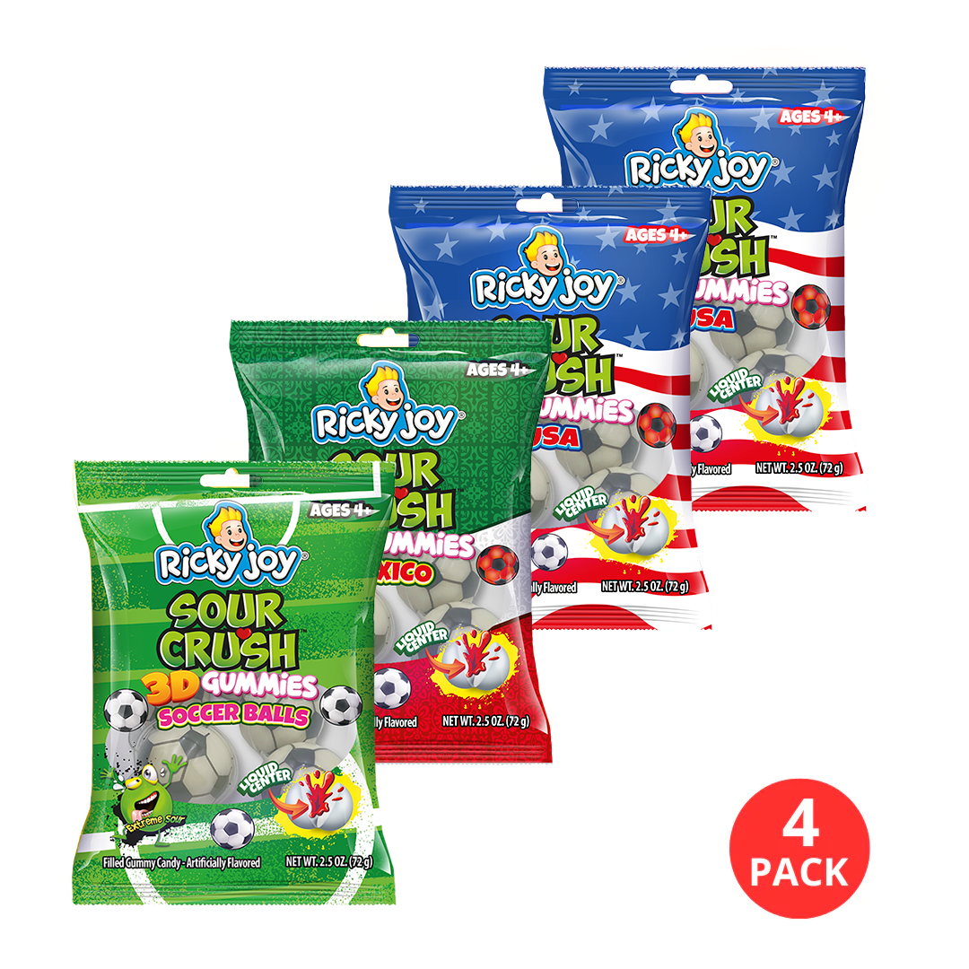 Ricky Joy® 3D™ Gummies - Variety Pack - 4 Bags - 3D Gummies Soccer Balls - 2.5 OZ each- Liquid Center Gummies Snack